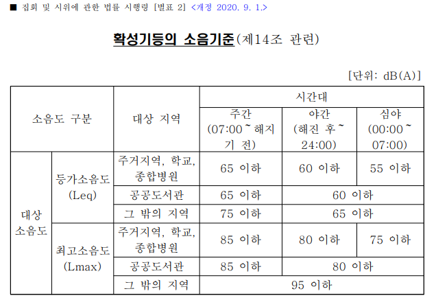 이와 같이, 대한민국 법률로는 헌법상 집회의 자유를 보장한다는 원칙에 의거하여 집회 주최자에게 유리한 요건(소음 보정치 등)과 국민 불편 최소화를 위한 요건(주거지역, 학교, 종합병원 등 소음 기준)을 균형있게 조화시켜 집회시위법으로 규정하였습니다.